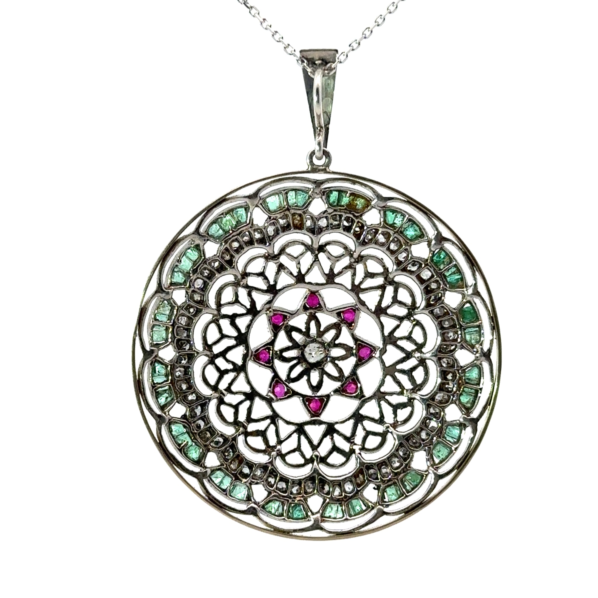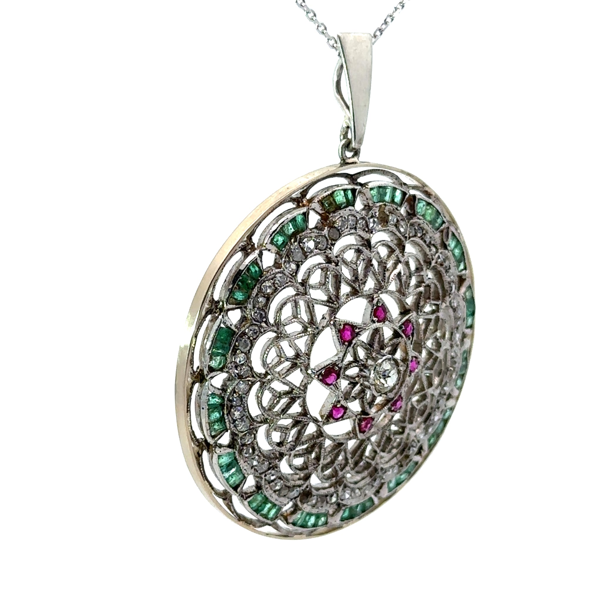 This exquisite Edwardian pendant showcases the timeless elegance of vintage craftsmanship. At its heart sits a .20ct Old Mine Cut diamond, surrounded by a stunning array of rose cut diamonds totaling 2 carats. Vibrant rubies (.40cttw) and a magnificent 1.50cttw emerald disc create a captivating color palette that captures light beautifully. Crafted in platinum with a silver bale, this piece merges precious metals and gemstones in perfect harmony. A treasure that brings historical sophistication and romantic allure to any collection.