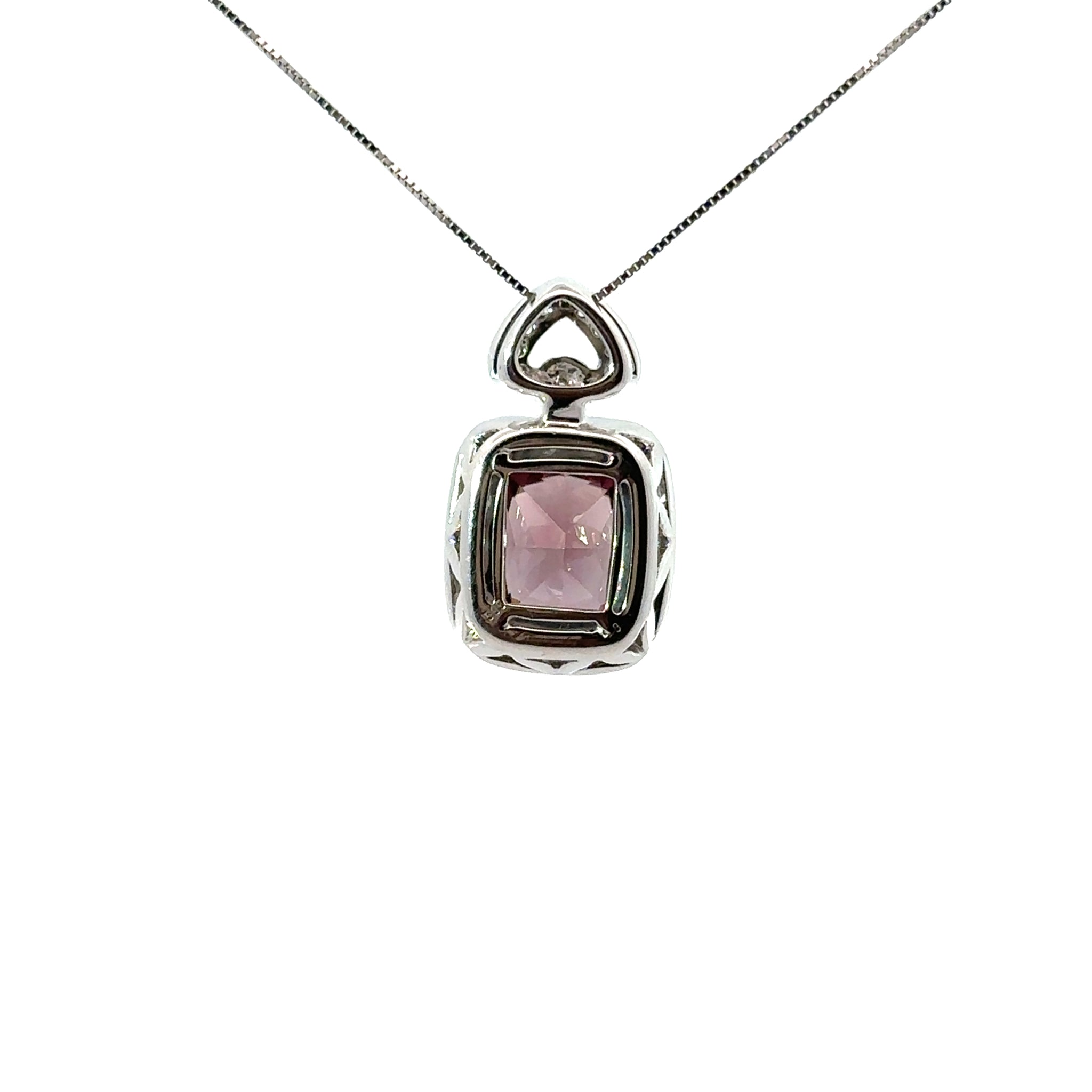 This elegant necklace showcases a stunning 6.38-carat purple zircon as its centerpiece, complemented by 0.54 carats of sparkling diamonds set in lustrous 14kt white gold. The sophisticated design balances bold color with refined craftsmanship, making it an ideal choice for those seeking a distinctive statement piece. Perfect for special occasions or as a treasured addition to any fine jewelry collection, this necklace combines contemporary elegance with timeless appeal.