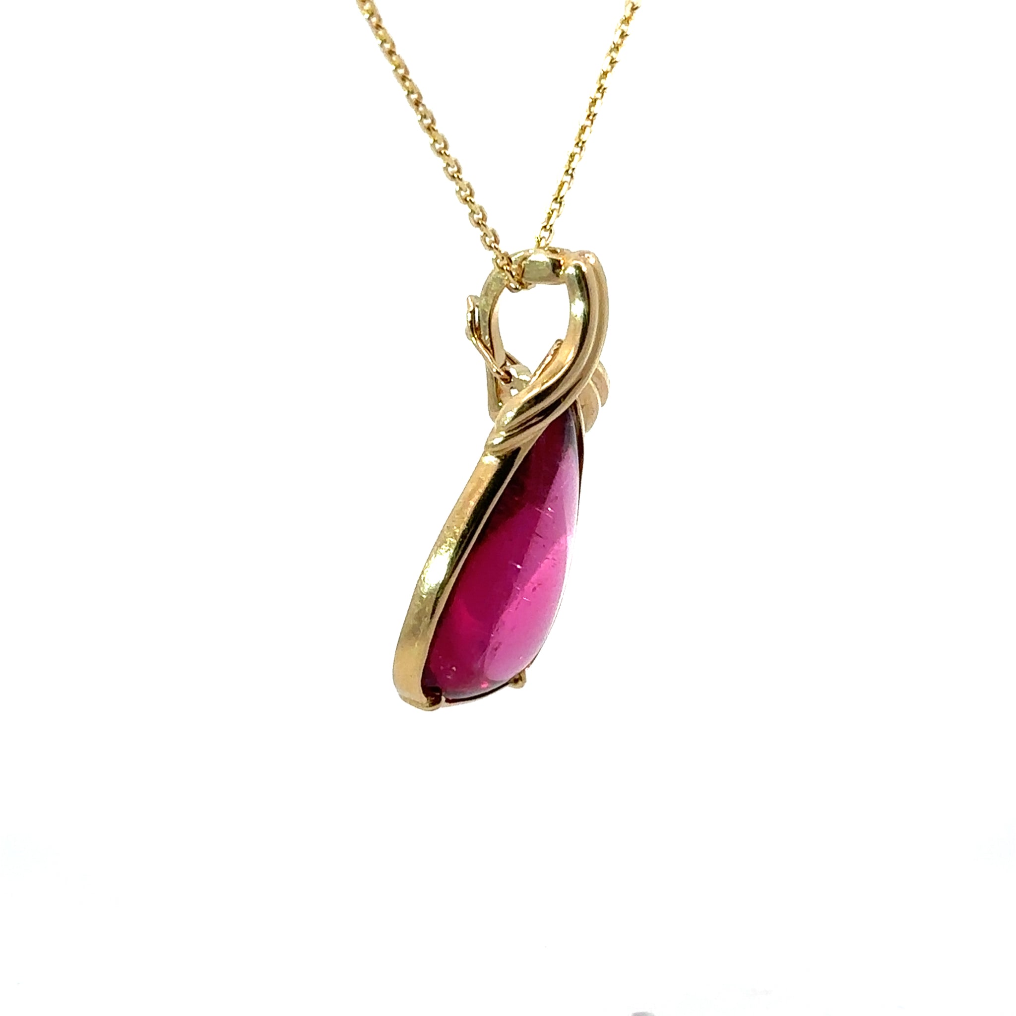 This exquisite pendant showcases a stunning 6-carat cabochon rubellite tourmaline, a rare and precious gemstone prized for its deep, mesmerizing red hue. The smooth, domed cut of the cabochon enhances the stone's natural brilliance and creates a sophisticated, timeless appeal. This late-century piece combines fine artistry with the enduring elegance of a classic gemstone, making it a meaningful addition to any jewelry collection or a treasured heirloom to pass down through generations.