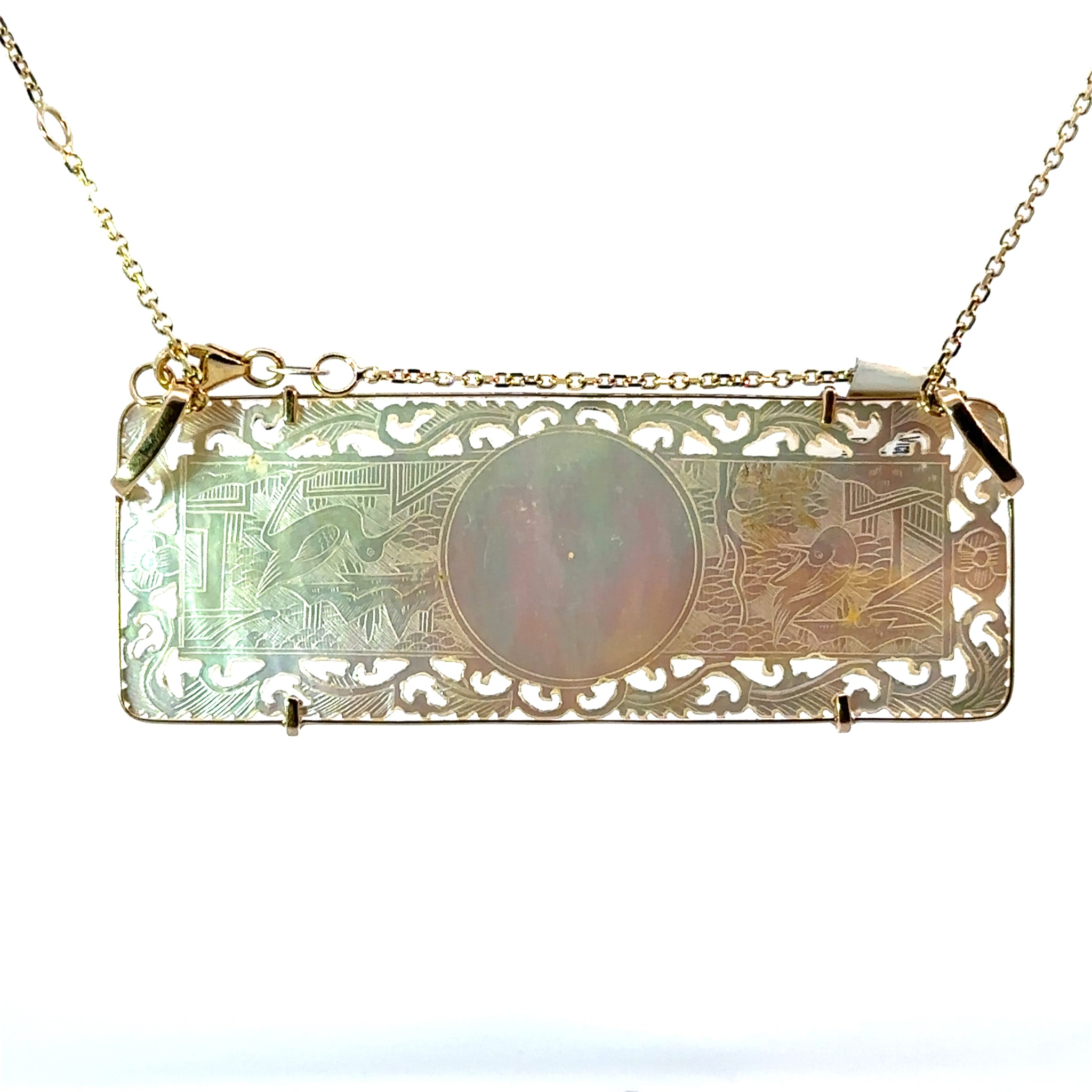 This exquisite Victorian-era necklace showcases a hand-carved mother of pearl gambling chip suspended from delicate 14kt yellow gold. The lustrous pearl pendant features intricate period detailing that captures the elegance and craftsmanship of a bygone era. Perfect for collectors of antique jewelry or anyone seeking a distinctive statement piece with historical character, this necklace blends timeless sophistication with genuine artisanal appeal. A treasured addition to any fine jewelry collection.