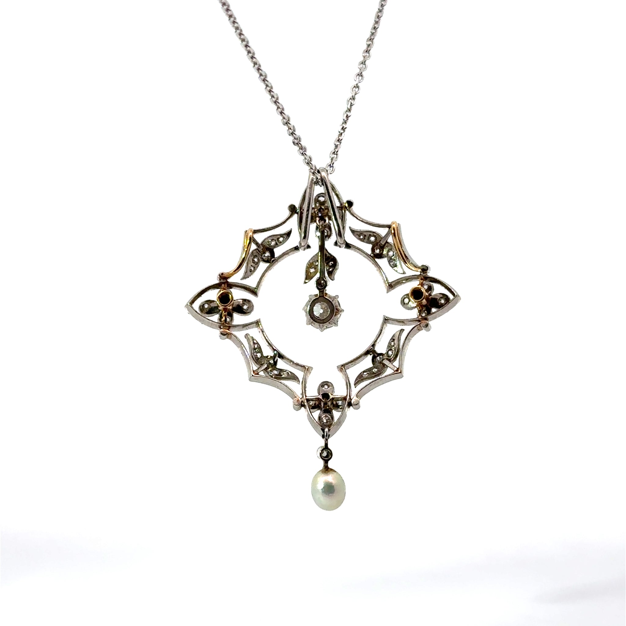 Discover the timeless beauty of this Art Deco pendant, a wonderful piece that brings together the best of vintage elegance. The centerpiece features a radiant .50-carat Old European cut diamond, surrounded by approximately 1 carat of carefully chosen antique cut diamonds that enhance its natural brilliance. A delicate natural pearl drop completes the design with graceful sophistication. Set in platinum, this pendant is built to last and treasure for generations. Whether you're drawn to Art Deco's distinctive style or seeking a meaningful heirloom piece, this pendant offers the perfect blend of historical charm and enduring quality that makes every moment feel special.