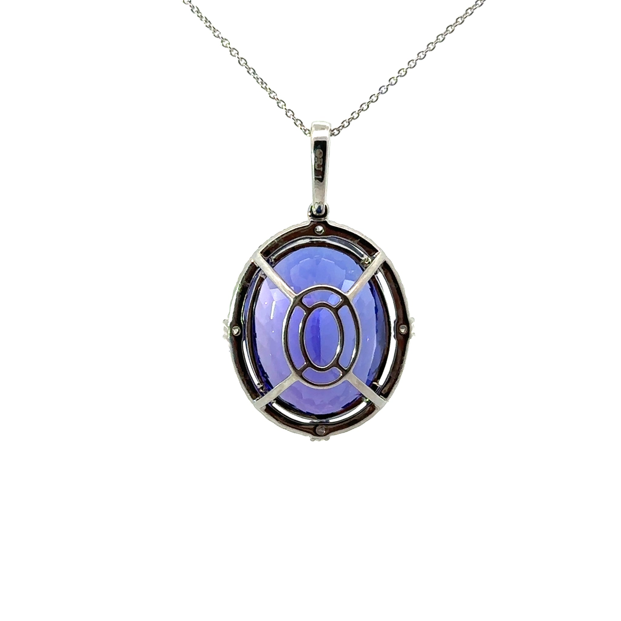This stunning pendant showcases a magnificent 26.21-carat oval tanzanite, prized for its rich, mesmerizing blue-violet hues and exceptional clarity. Set in lustrous 18kt white gold, the gem-quality stone is elegantly framed by sparkling diamonds totaling 0.25 carats, adding brilliant contrast and sophistication. The modern design balances bold statement appeal with refined elegance, making it perfect for special occasions or as a treasured everyday luxury. A truly exceptional piece that celebrates the rare beauty of tanzanite.
