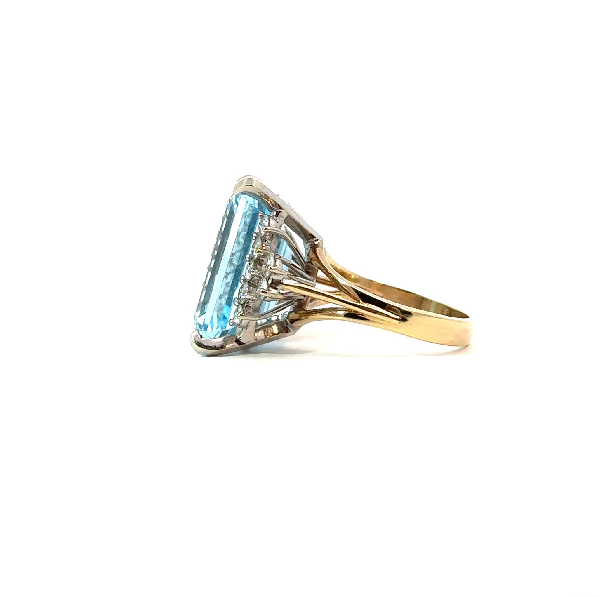 This stunning late-century ring showcases a magnificent 15-carat emerald-cut blue topaz as its centerpiece, complemented by approximately 1.40 carats of sparkling diamonds set in lustrous 14kt yellow gold. The classic emerald cut highlights the topaz's rich blue hue while the diamond accents add brilliance and sophistication. A timeless piece that combines vintage charm with enduring elegance, perfect for those who appreciate distinctive gemstone jewelry with character and presence.
