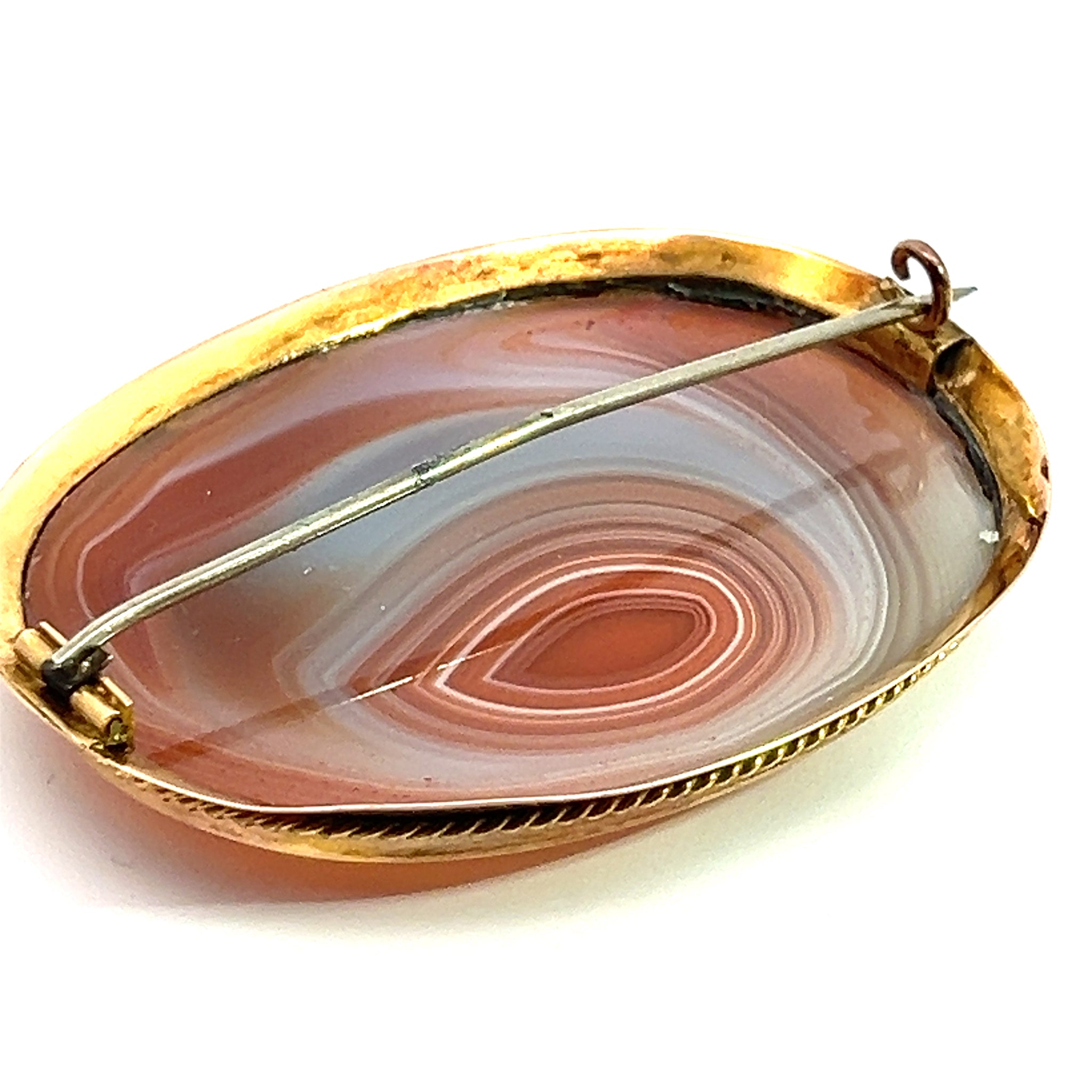 A detailed image showcasing the Victorian 14ktyg Large Banded Agate Pin, highlighting its oval-shaped, polished banded agate stone with intricate layers of pink, white, and brownish hues. The gemstone is elegantly set in a 14kt yellow gold bezel adorned with a twisted rope border design.