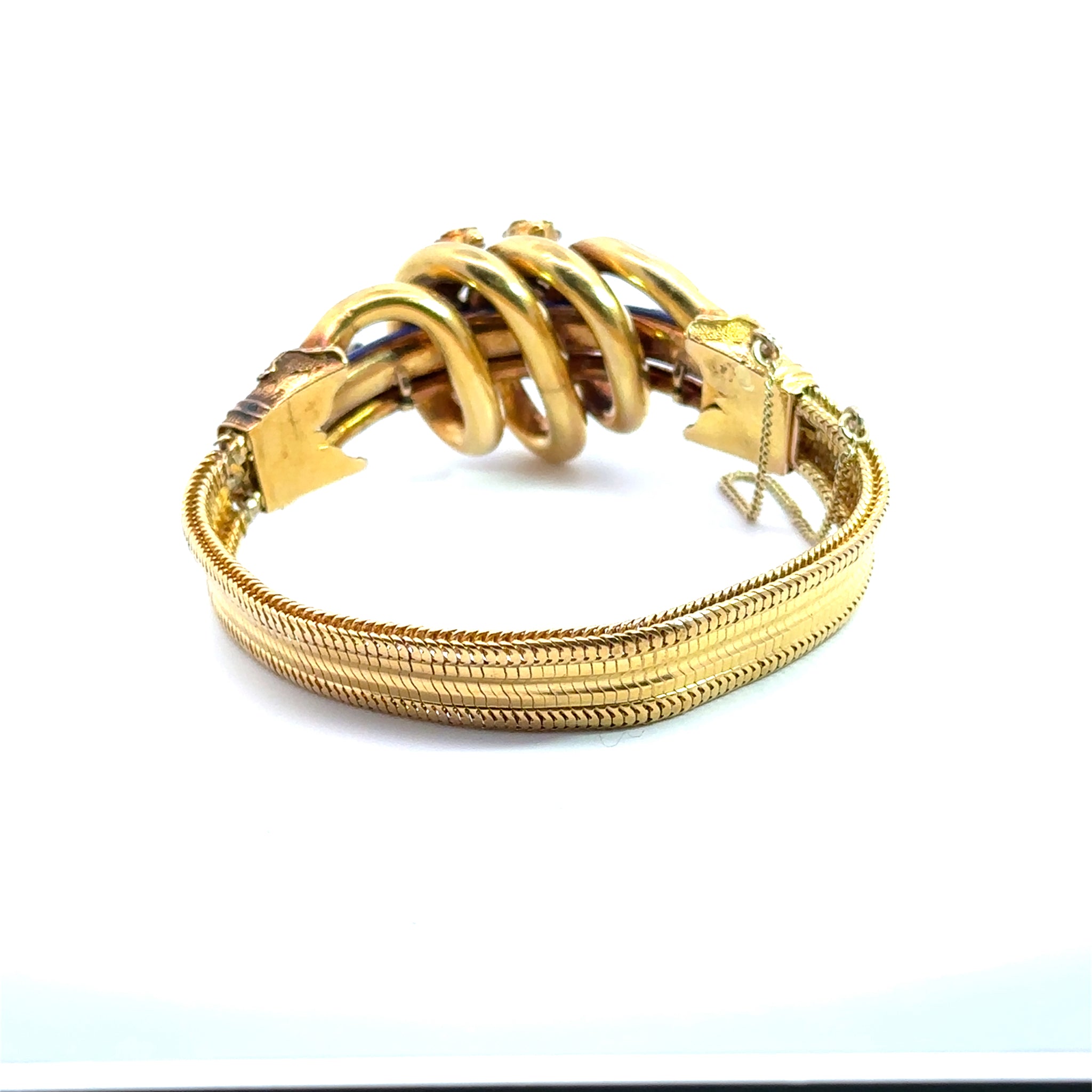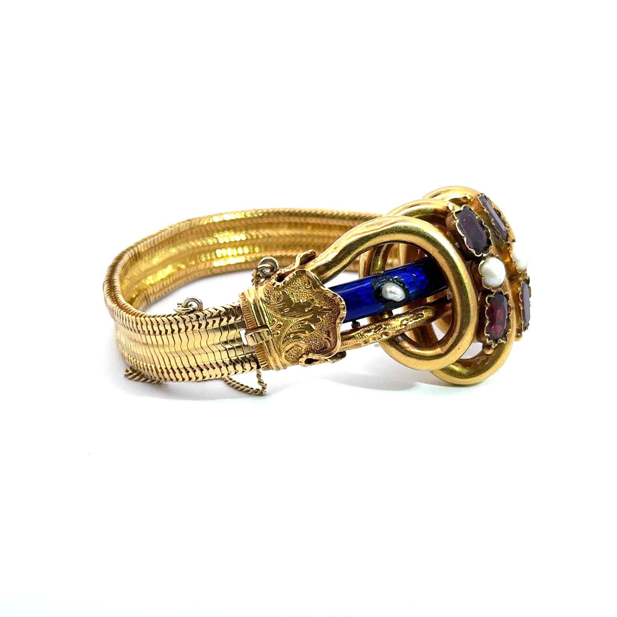 This exquisite Victorian bracelet features a rich 15k yellow gold setting adorned with 3 carats total weight of deep red garnets, lustrous pearls, and vibrant cobalt blue enamel accents. Its intricate craftsmanship captures timeless elegance, making it a stunning statement piece that complements any refined collection. Perfect for adding a touch of vintage charm to your ensemble or as a meaningful heirloom gift.